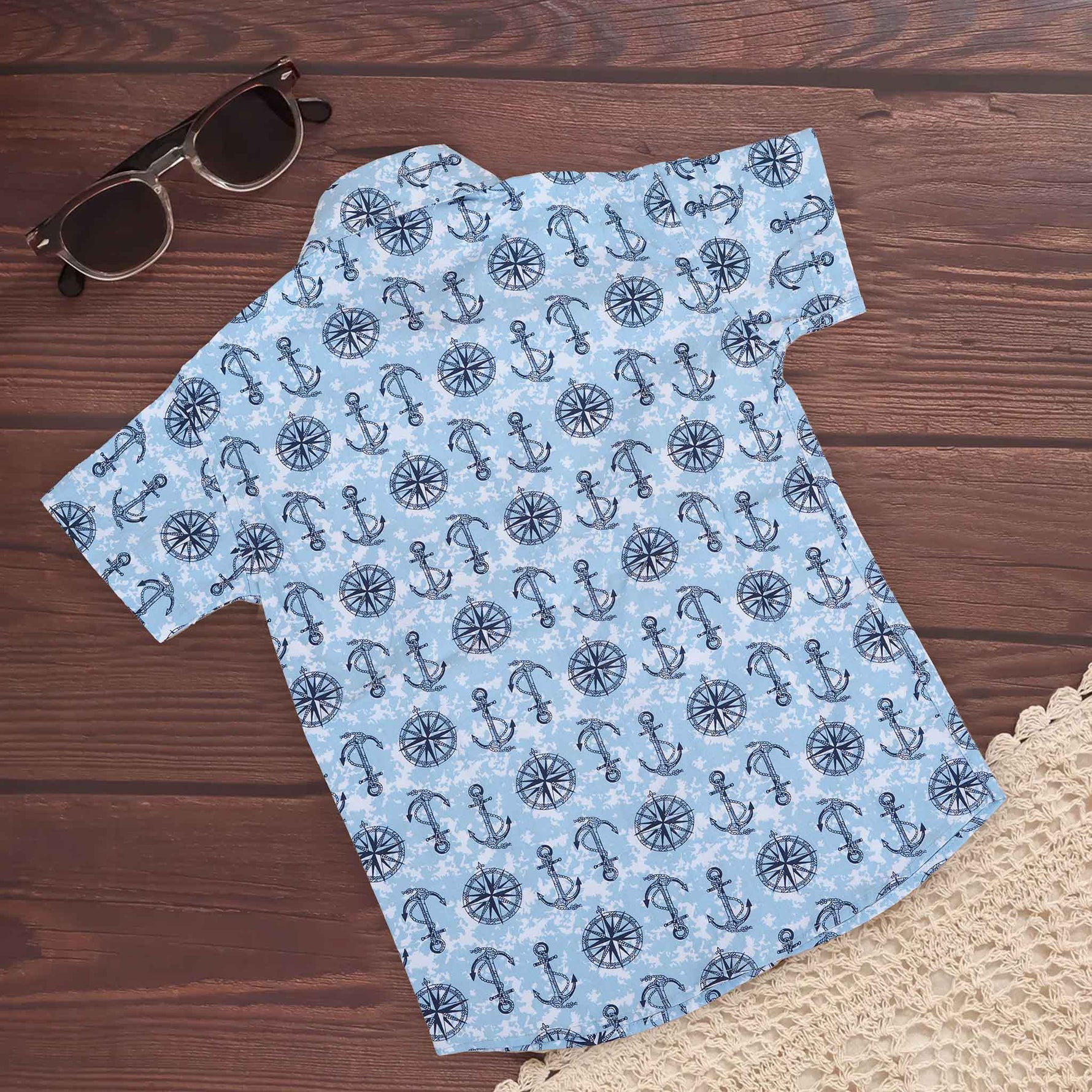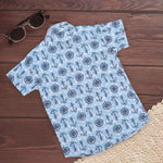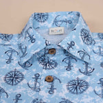 Set sail on a style adventure with this nautical-themed boys printed shirt featuring anchors and compass wheels on a soothing sky-blue base. This design is perfect for little explorers who love the sea, with an eye-catching, all-over marine-inspired print that’s both fun and trendy.