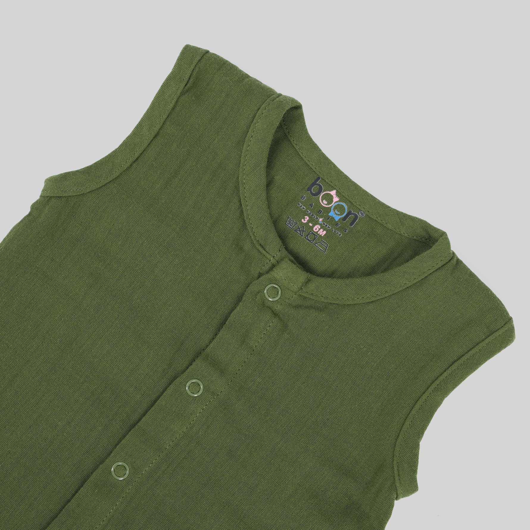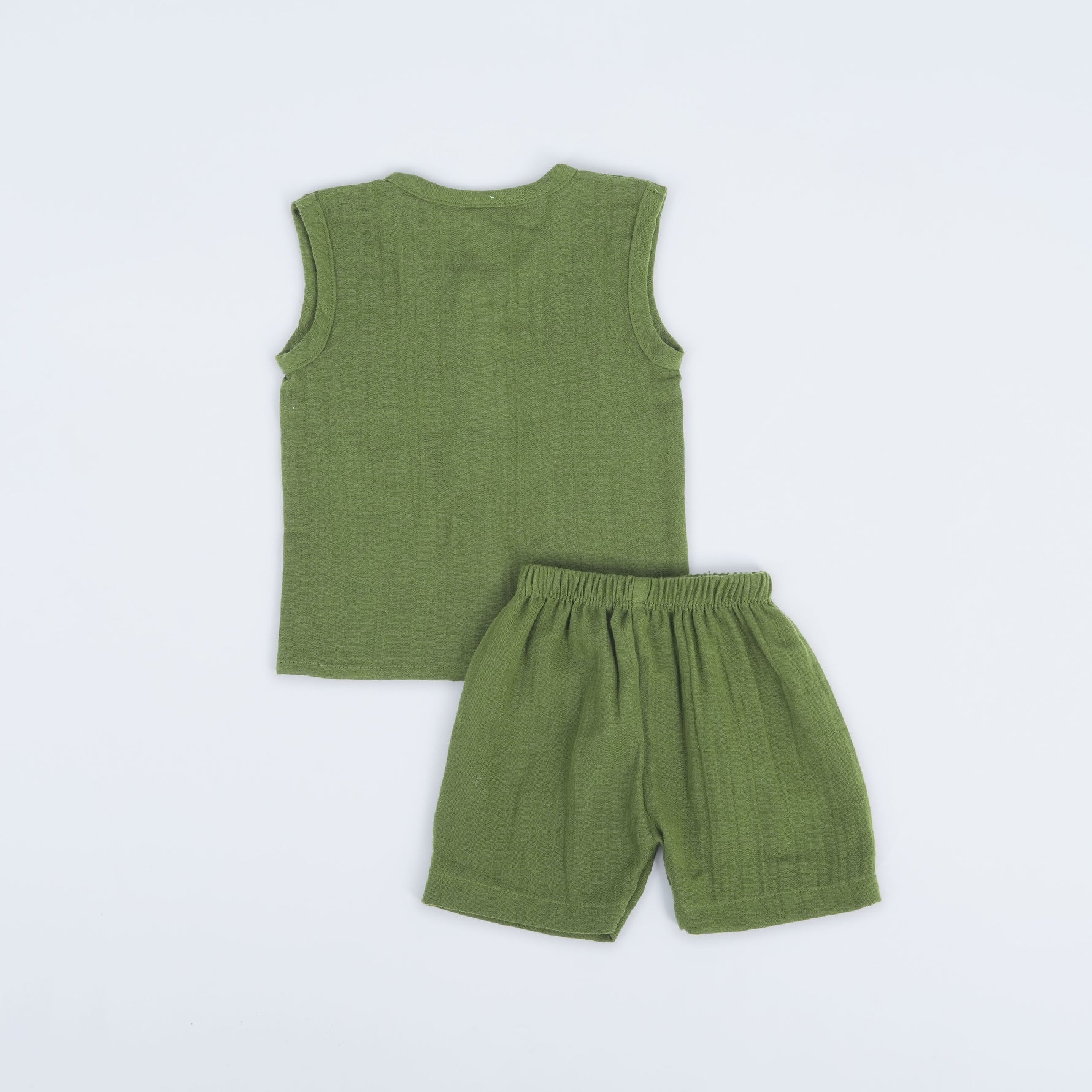 Bring nature-inspired calm to your baby’s wardrobe with our Olive Green Crinkled Muslin Jabla and Shorts Set. This unisex baby set is made from premium crinkled muslin fabric, specially chosen for its breathability and gentle touch. The sleeveless jabla with snap buttons and elastic shorts ensures freedom of movement — perfect for active little ones during warm seasons.