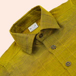 Design: Mustard/olive multi-check pattern with golden-thread detailing