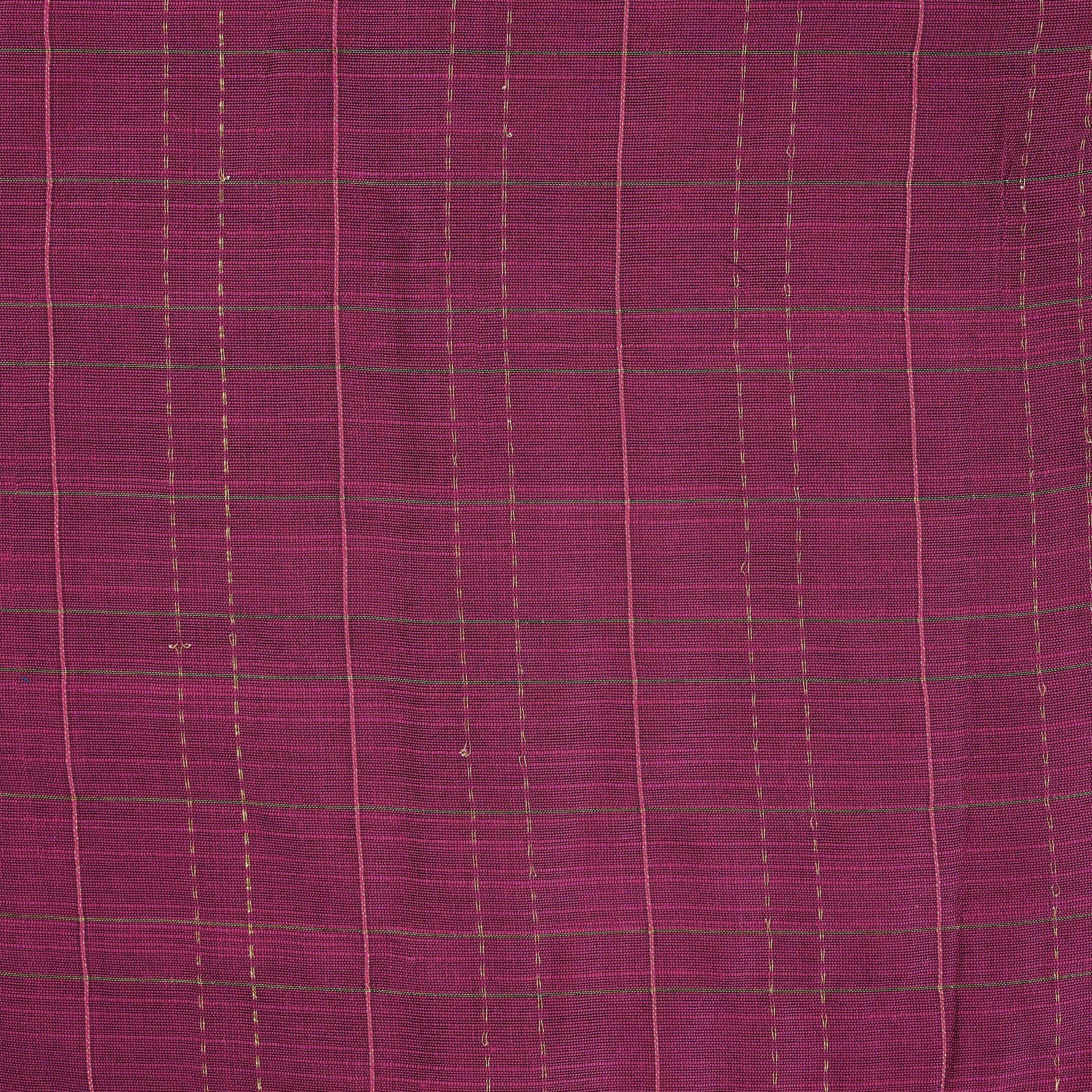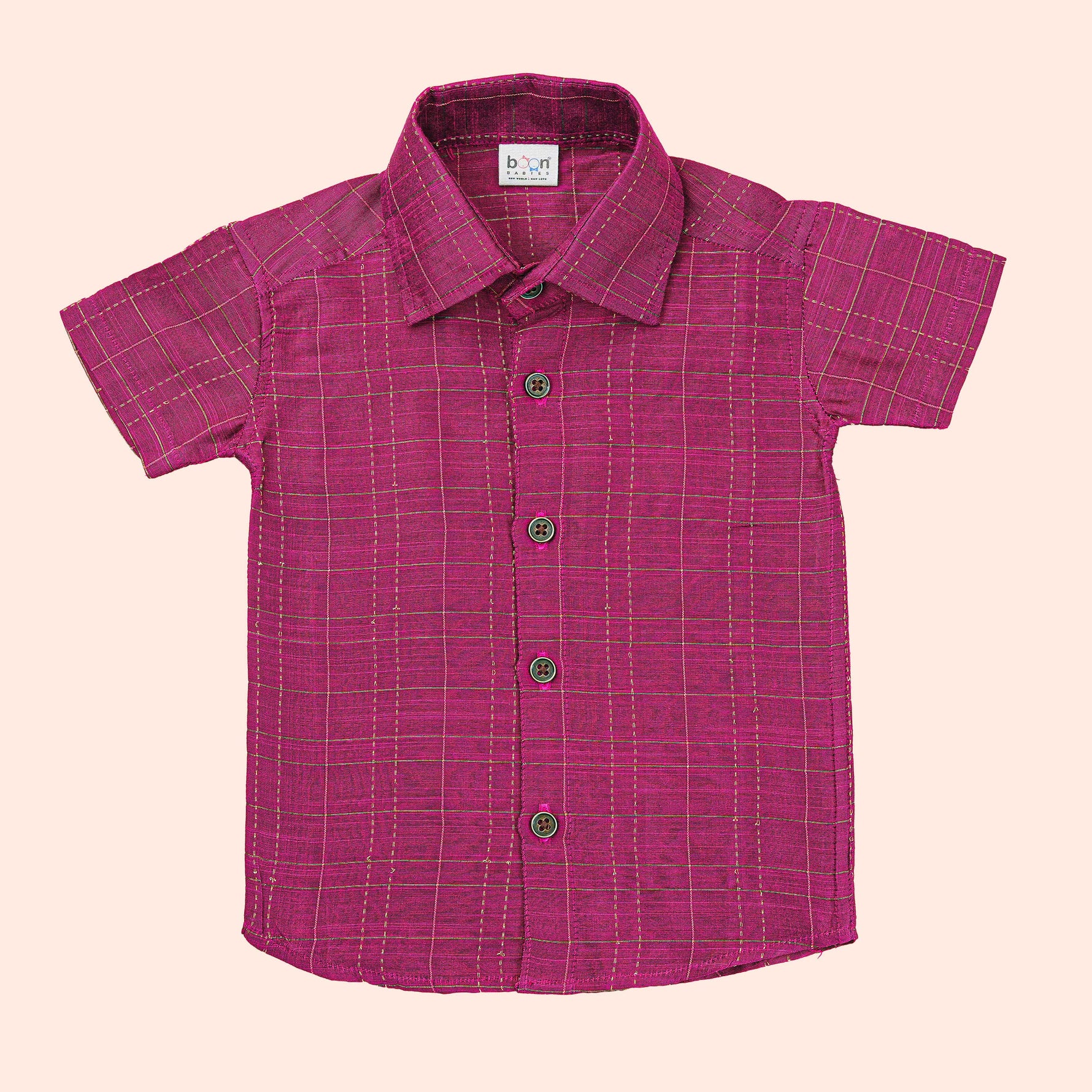 The shirt features a vibrant pink–magenta base with golden-thread multi-check weaving, adding a luxurious festive shine. The straight collar gives a neat, smart, and traditional finish—perfect for cultural celebrations and outdoor festive functions.