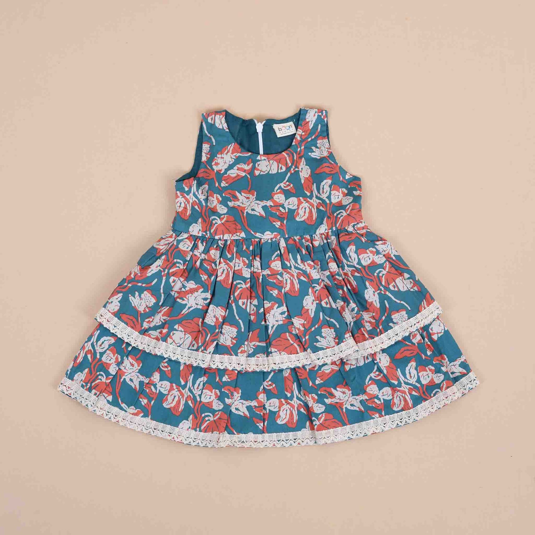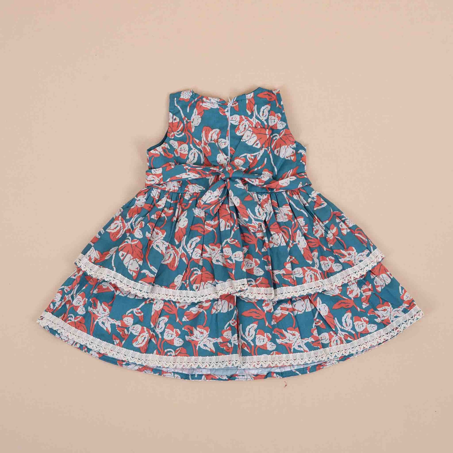 Crafted from soft and breathable cotton fabric, this frock ensures maximum comfort for all-day wear. The tiered skirt with delicate lace detailing enhances the overall charm, creating a playful and stylish look. The sleeveless design with a back zipper closure provides a snug fit while allowing easy dressing.