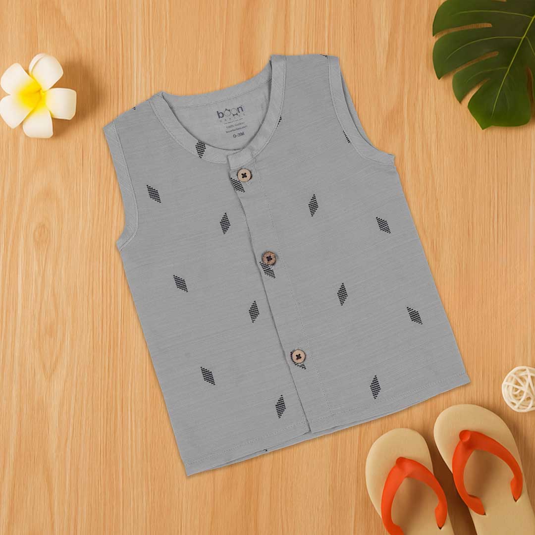 Keep your little one comfy and cute in our Ethnic Jabla, crafted with a perfect blend of tradition and softness. Made for babies aged 0 to 24 months, this sleeveless jabla ensures maximum comfort with its breathable cotton fabric and easy front-open design. The subtle ethnic weave and tiny motifs bring a traditional touch, while the wooden buttons make dressing effortless and stylish. Perfect for daily wear, festive occasions, or gifting — this jabla keeps your baby cool, comfortable, and adorable all day long.