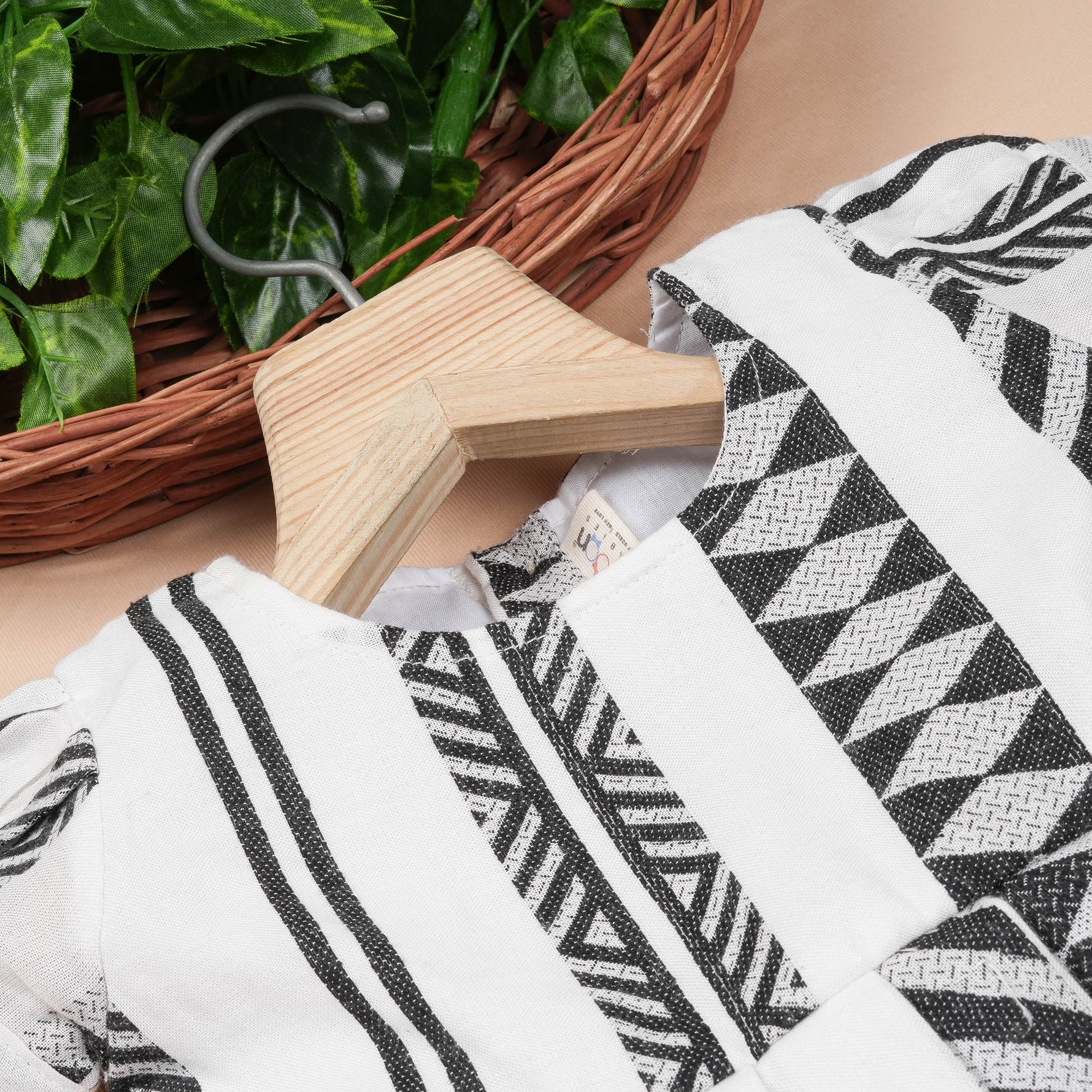 Give your little princess a premium casual look with our Boon Babies Girls Cotton Bow Frock, crafted from soft and breathable cotton for all-day comfort. Designed in an elegant black & white geometric stripe print, this frock brings a stylish outdoor vibe while staying gentle on sensitive baby skin.
