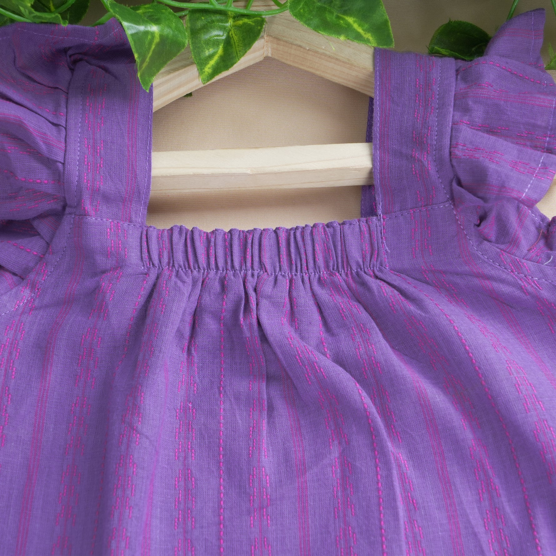 This set features a soothing lavender purple base enhanced with subtle woven stripe textures, giving it an elegant yet playful casual look. The gathered neckline and frill shoulder straps add charm, while the elasticated shorts ensure a comfortable fit for active little girls.
