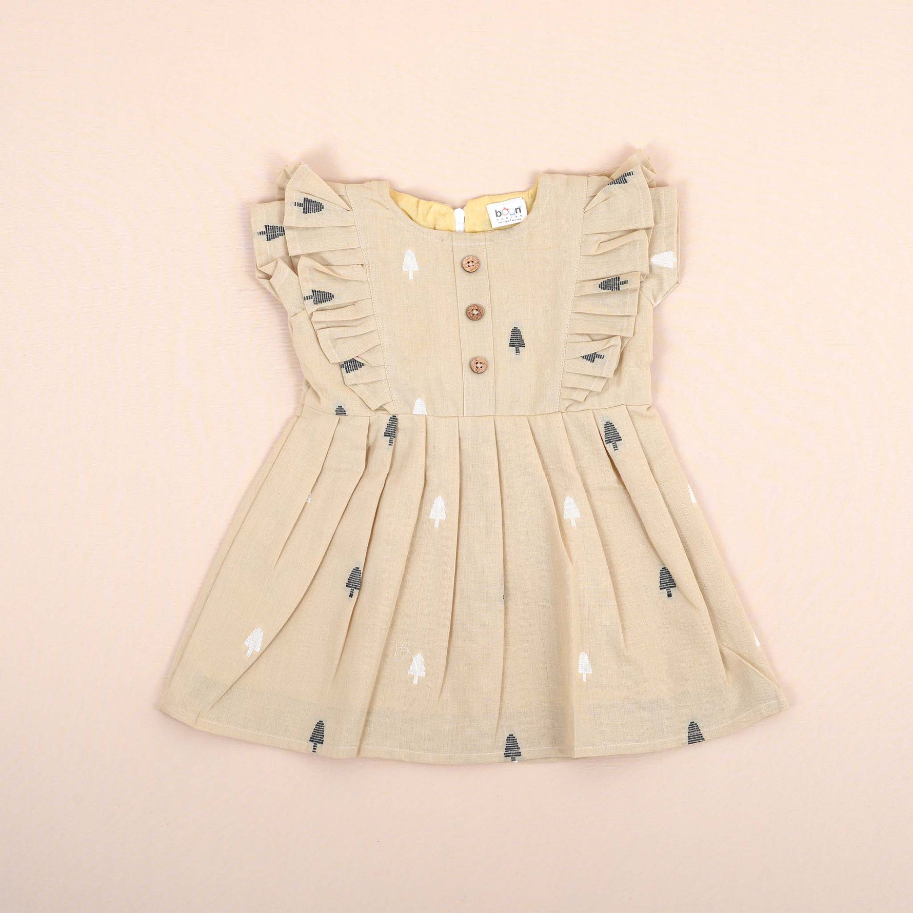 Add a touch of nature-inspired elegance to your child’s wardrobe with this girls printed frock in a classic beige tone. The frock is designed with charming tree motifs in contrasting shades of white and charcoal black, giving it a playful and earthy vibe. The pleated skirt flows beautifully, offering ease of movement and a flared silhouette, perfect for twirling!