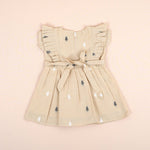 Beige Girls Printed Frock with Ruffle Sleeves and Pleated Skirt