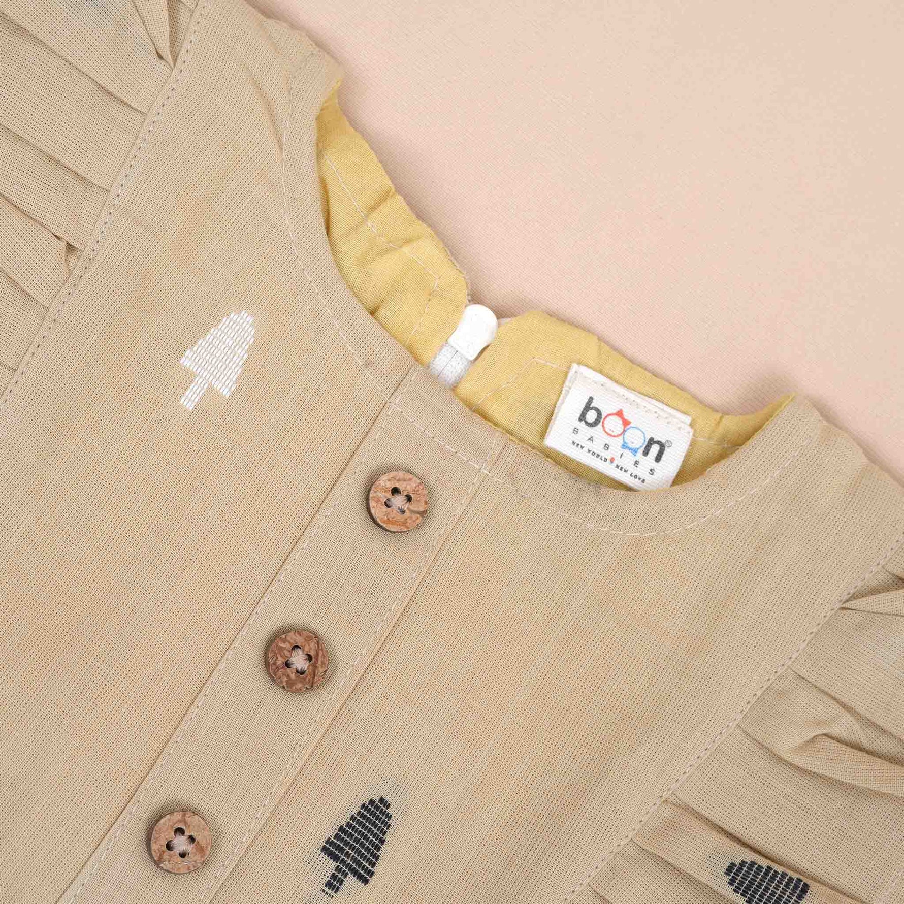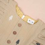 Made from soft and breathable cotton fabric, this frock ensures all-day comfort for your little one. The bodice features frilled cap sleeves and decorative wooden buttons for a rustic yet modern look. Whether it’s a picnic, playdate, or family gathering, this frock blends style with simplicity effortlessly.
