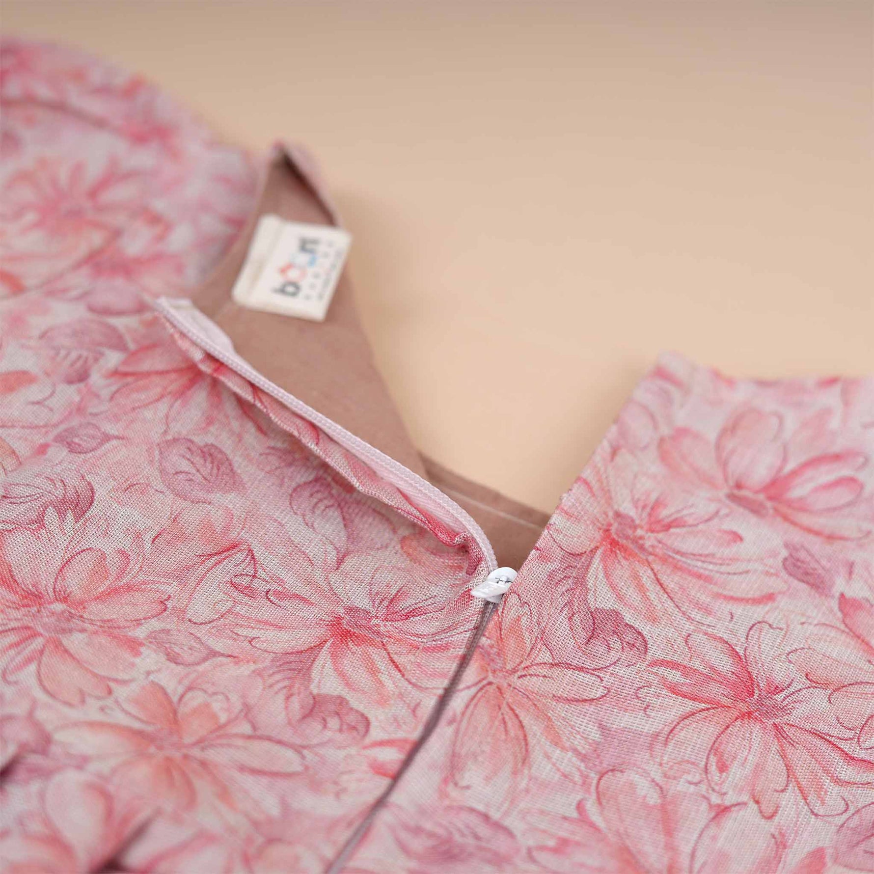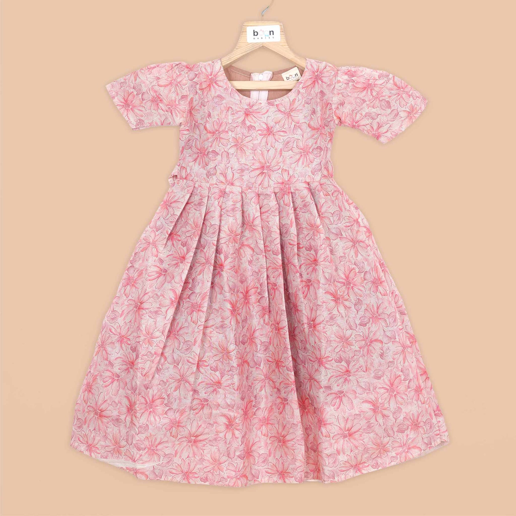 Dress up your princess in this Blush Blossom Maxi Frock, featuring a soft pink floral print that exudes charm and elegance. This Tissue Cotton frock is a blend of comfort and style, making it ideal for summer outings, family get-togethers, and festive celebrations. The lightweight fabric ensures breathability, while the pleated skirt design offers a flowy and princess-like appeal.
