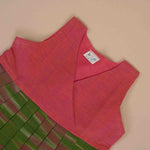 Make a style statement with this Pink & Green cotton frock for girls, crafted from rich South cotton fabric. The green sleeveless bodice is designed with a classic crossover, while the pleated skirt features a bold purple hue with geometric woven detailing. A perfect ethnic frock for girls for festive occasions and cultural events.