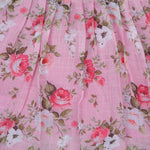 Delicate yet bold, this pink floral printed linen frock is a lovely blend of softness and charm for little girls. Adorned with blooming roses in red, blush, and white over a pastel pink background, this frock is perfect for festive events, playdates, or casual family gatherings. The square neckline with dainty lace trimming and flutter sleeves adds a feminine grace, while the pleated waistline enhances its flowy silhouette.