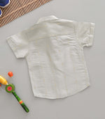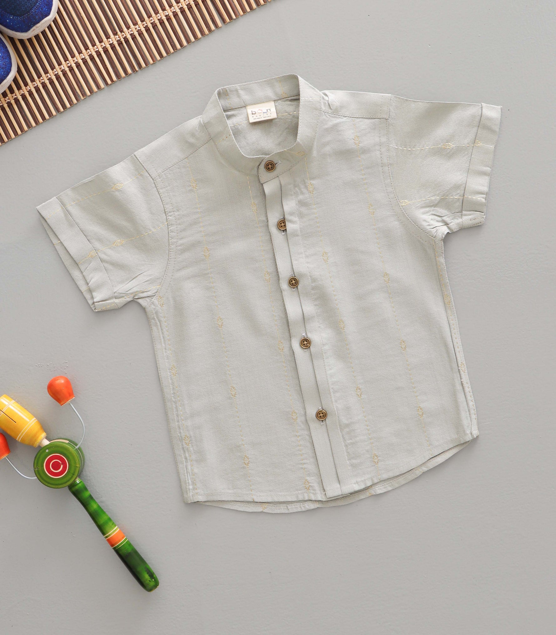 Elevate your little one’s festival style with our Boon Babies Boys Silk Mandarin Collar Shirt, designed in a classy silver grey shade. Crafted using a smooth silk-blend fabric, this shirt features subtle self-woven golden motifs and vertical ethnic lines that add an elegant and traditional touch to every celebration.