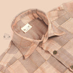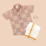 Let your little prince shine in our Beige Silk Ethnic Shirt and Dhoti Set – a timeless outfit crafted with care for your most cherished occasions. The soft-toned beige silk shirt features elegant golden checks, beautifully complemented by a cream dhoti with golden zari border. Perfect for weddings, poojas, and festive days, this set blends classic charm with gentle comfort.
