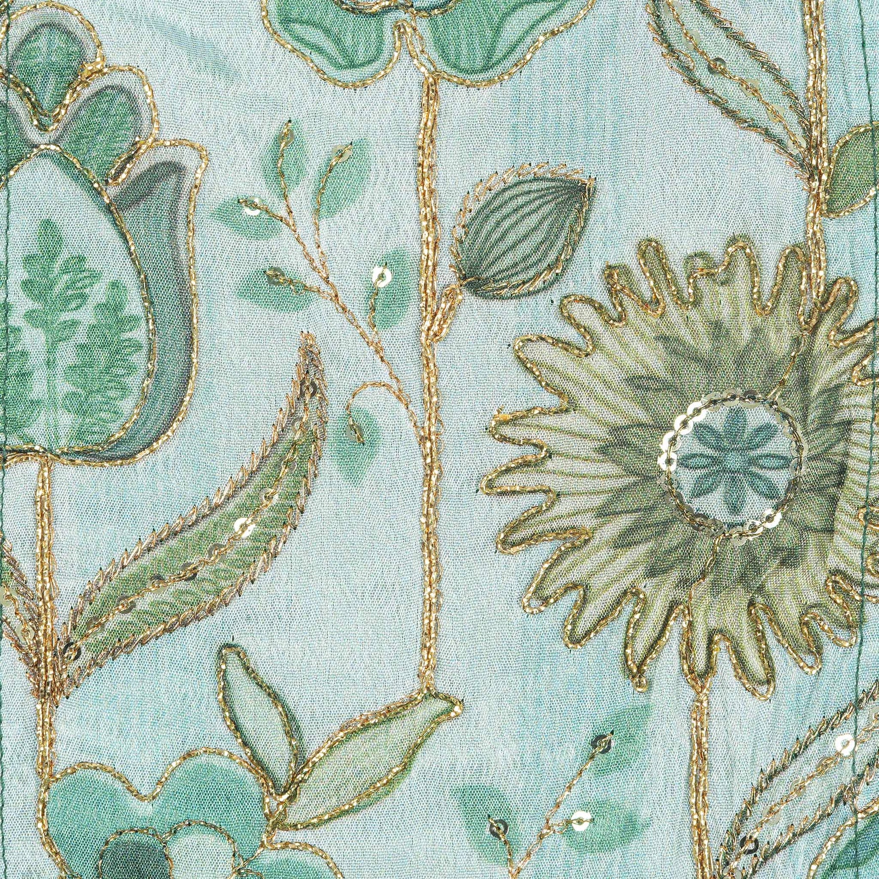 👕 Top: Silk panel shirt with floral embroidery and wooden buttons