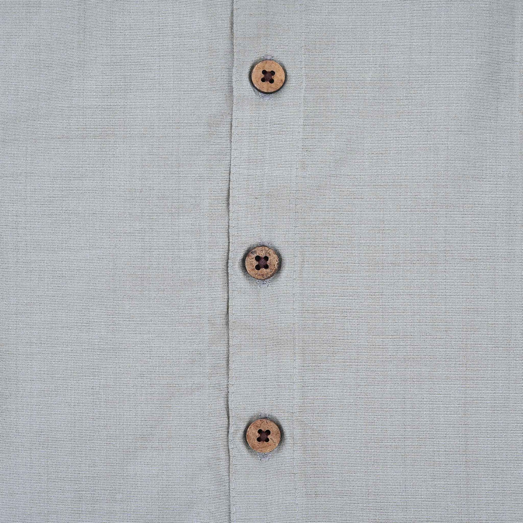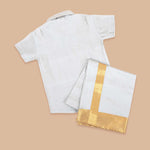 Let your little one shine in this boys pattu dress featuring a radiant Grey silk shirt paired with a classic golden border pattu dhoti. The shirt is designed with a collared neckline and traditional-style buttons, made from soft silk blend fabric that is gentle on baby skin and breathable for long hours of wear. The pre-stitched dhoti comes in pure white with elegant gold zari borders, making it a standout piece for festive wear.
