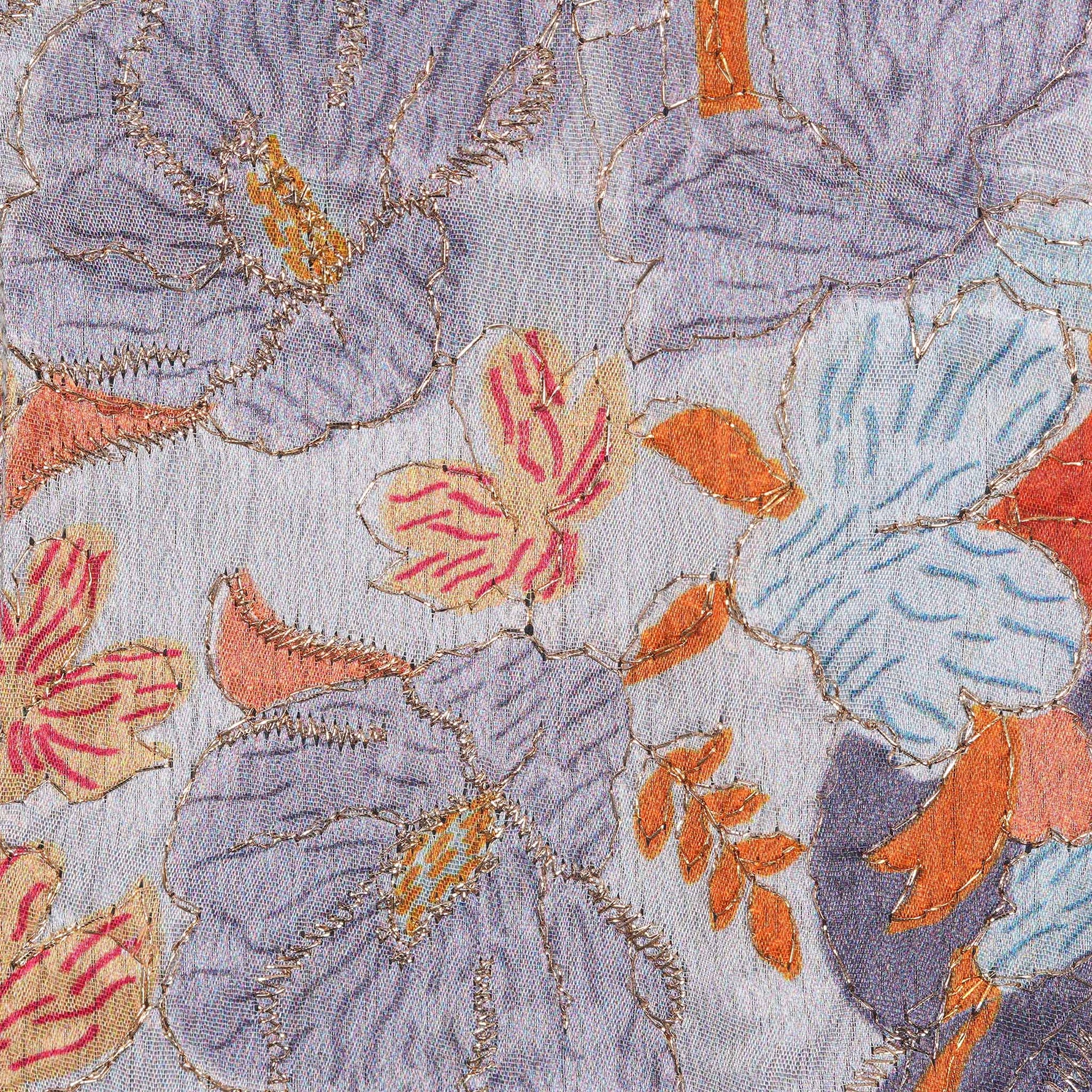 👕 Top: Light grey silk shirt with multicolor floral jacquard panel and classic wooden buttons