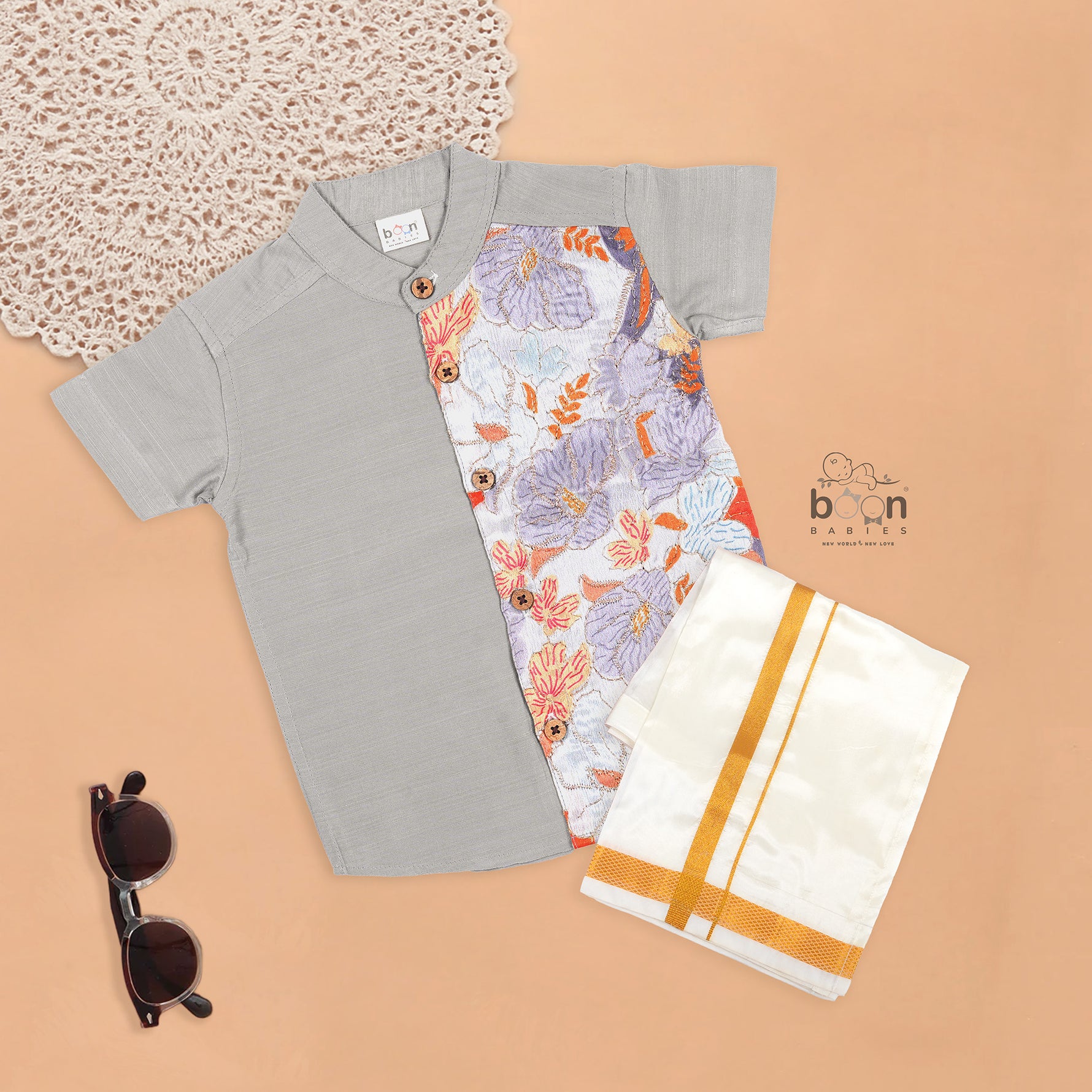 Add a touch of subtle elegance to your little one's ethnic look with this Light Grey Silk Shirt and White Pattu Dhoti Set from Boon Babies 🕊️✨ Crafted for boys aged 12 months to 5 years, this outfit features a soft silk shirt with a pastel floral panel, making it a perfect pick for traditional functions and poojas.