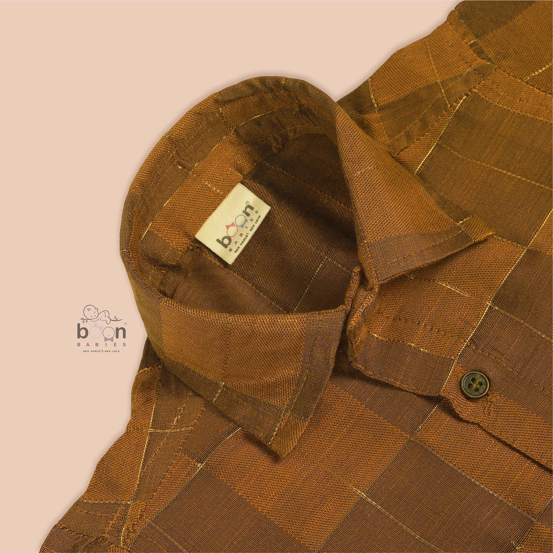 👕 Shirt: Mustard silk with golden checks and front-button closure